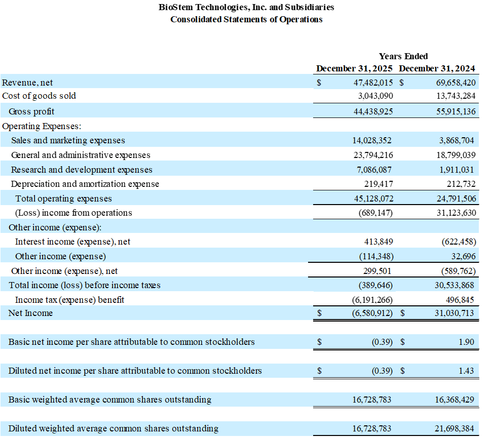“BioStem delivered a solid finish to 2025, with fourth quarter revenue reflecting continued penetration of the physician office market, ” said Jason Matuszewski, CEO and Chairman of the Board of BioStem. “As we enter 2026, BioStem is a fundamentally stronger and more diversified regenerative medicine company following the addition of the BioTissue surgical and wound assets, which have expanded our product portfolio and commercial reach across both hospital and physician office settings. With focused commercial channels serving these sites of care and increased exposure to commercially insured patient populations, we believe we are well positioned to navigate the evolving reimbursement landscape as we execute on our strategy to drive long-term growth and create value for our shareholders.”