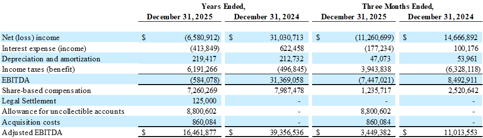 Adjusted EBITDA for the fourth quarter was $3.4 million, compared to $11.0 million in Q4 2024. The decline reflects lower revenue, lower gross profit, and higher operating expenses.