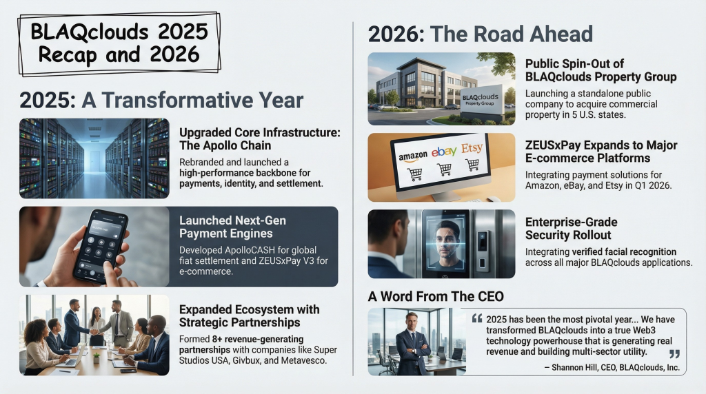 - BLAQclouds rebuilt its full Web3 stack in 2025, positioning the company for scalable revenue across payments, identity, blockchain, and media.
