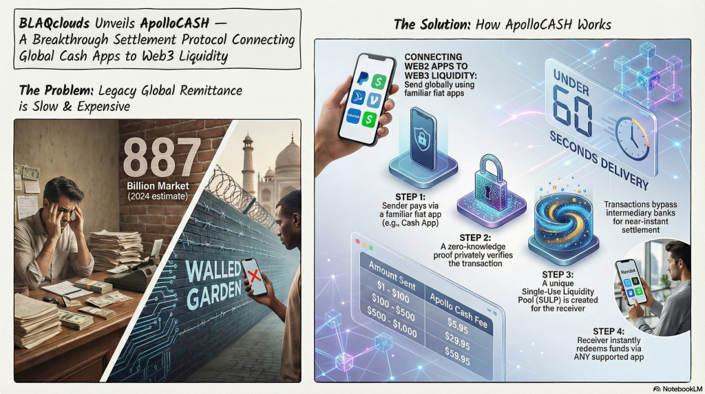 BLAQclouds launches ApolloCASH, a zero-knowledge settlement protocol that converts global cash-app payments (Cash App, PayPal, Venmo, Zelle, Wise, Revolut) into instant on-chain liquidity using single-use liquidity pools.