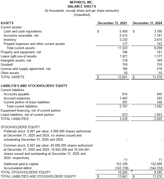 As of December 31, 2025, Nephros had cash and cash equivalents of approximately $5.4 million, compared to $3.8 million as of December 31, 2024, and remains debt free.
