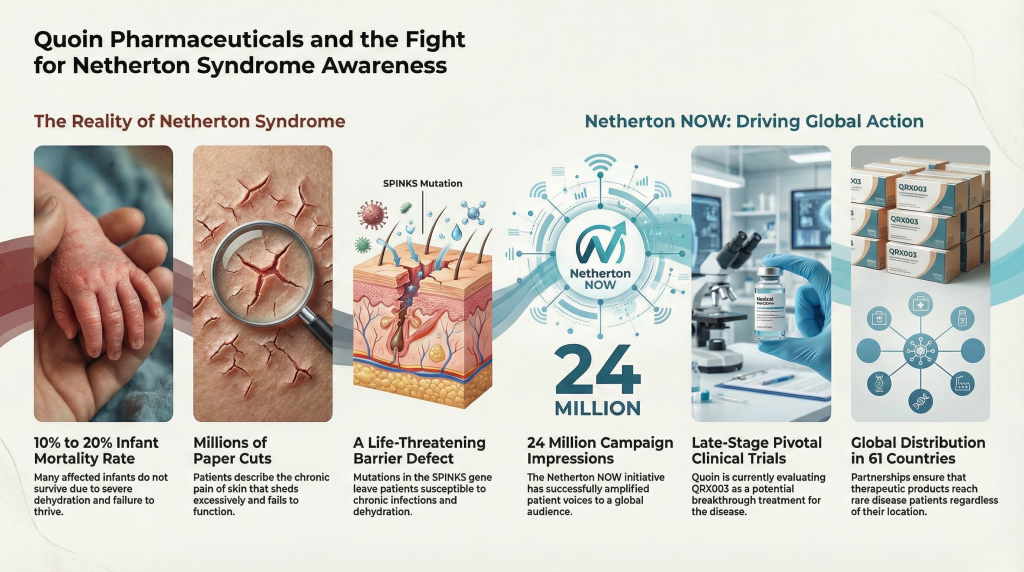 ASHBURN, Va., Feb. 26, 2026 – PRISM MediaWire (Press Release Service – Press Release Distribution) – In recognition of Rare Disease Day® 2026, Quoin Pharmaceuticals Ltd. (NASDAQ: QNRX) today highlighted the continued growth of its NETHERTON NOW awareness campaign, which seeks to amplify the voices of patients, caregivers and clinicians impacted by Netherton Syndrome, a rare genetic disease with no approved treatment or cure.