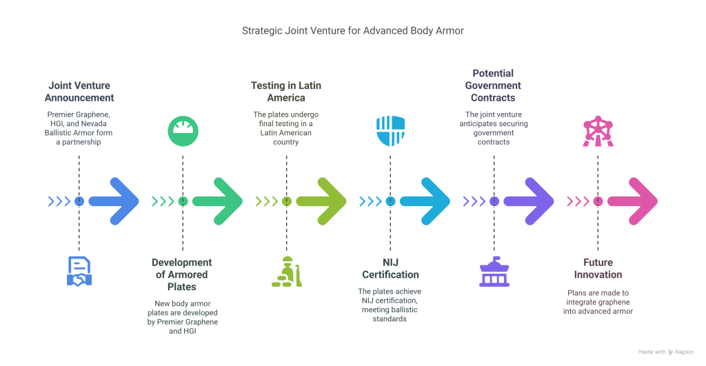 Joint venture poised for significant government contracts and future innovation: This collaboration is a significant step forward, potentially leading to future government contracts valued at $18 million, with three additional contracts pending. The venture also paves the way for Premier Graphene and HGI to begin manufacturing next-generation ballistic protection gear, integrating innovative materials like graphene into advanced armor plates and other applications. Future iterations will incorporate proprietary industrial hemp graphene from HGI and Premier Graphene Inc., as well as other cutting-edge materials from affiliated entities like Biographene Technologies