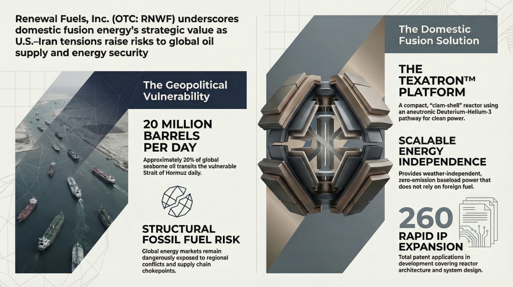 Southlake, Texas, March 03, 2026 – PRISM MediaWire (Press Release Service – Press Release Distribution) – Renewal Fuels, Inc. (OTC: RNWF) (“RNWF”, “American Fusion” or the “Company”), today issued the following commentary regarding the escalating military conflict between the United States and Iran and its potential implications for U.S. energy security and the long-term strategic relevance of domestically developed fusion energy platforms.