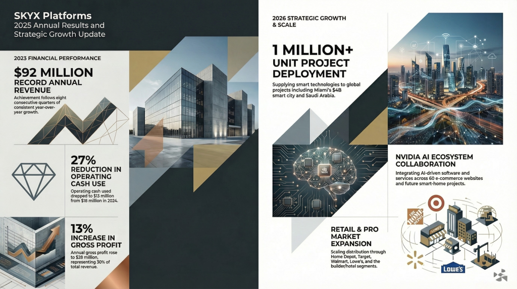 MIAMI, FL, March 26, 2026 – PRISM MediaWire (Press Release Service – Press Release Distribution) – SKYX Platforms Corp. (NASDAQ: SKYX) (d/b/a SKYX Technologies) (the “Company” or “SKYX”), an award winning, highly disruptive advanced and smart home platform technology company with over 100 U.S. and Global pending and issued patents and a portfolio of 60 lighting and home décor websites, with a mission to make homes and buildings become advanced-safe-smart instantly as the new standard, today reported its financial and operational results for the Fourth Quarter and Fiscal Year ended December 31, 2025.